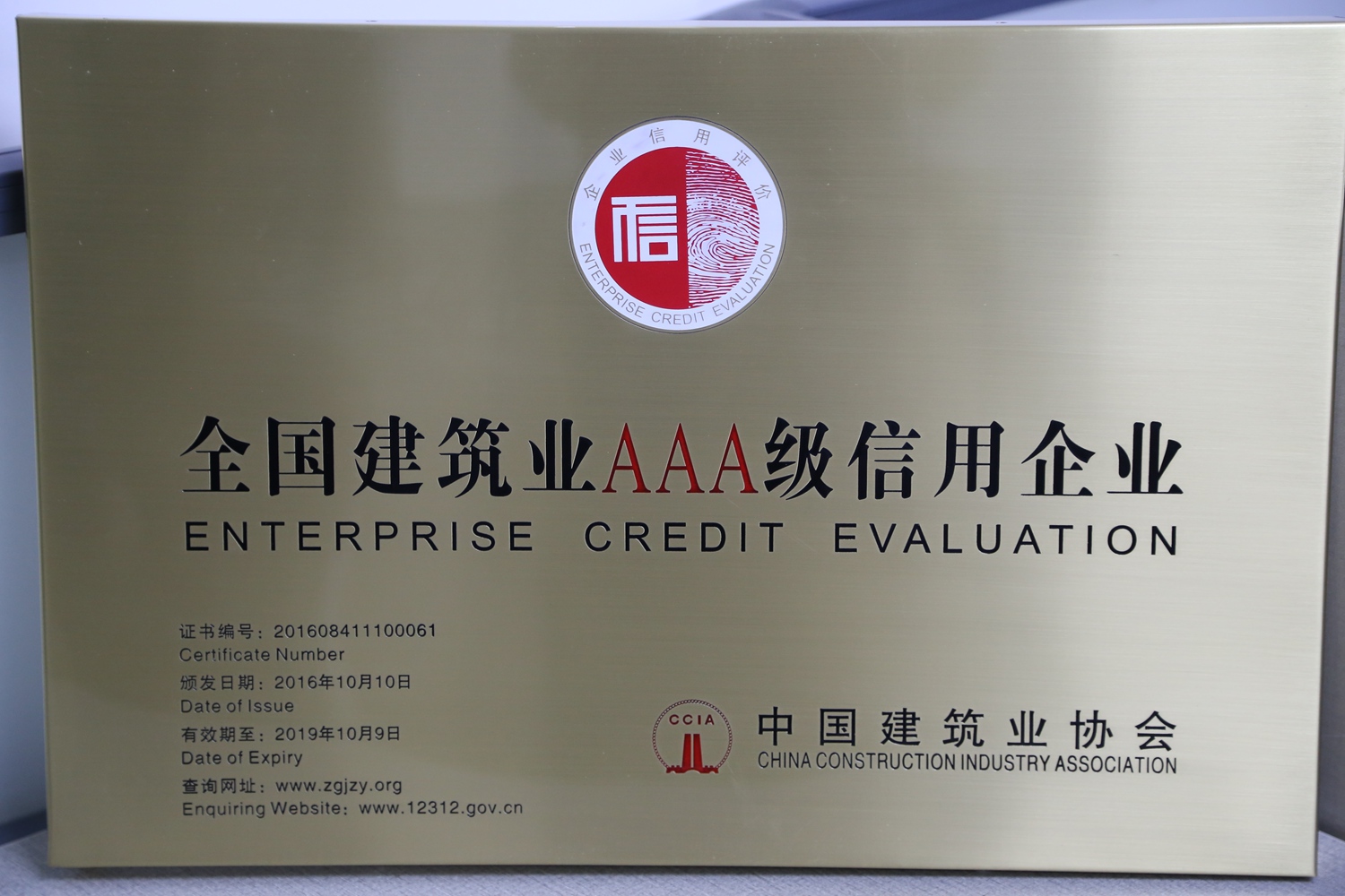 企業信用等級是由中國建筑業協會經審核、篩選和評定而確定的,有效期3年,每年復審一次。由于公司一直本著誠信、服務、質量為上的原則,獲得了中國建筑業協會及社會大眾的認可,2016年10月公司再度榮獲“AAA級信用企業”的榮譽稱號。這個全國建筑行業都為數不多的榮譽是對我們企業的肯定及嘉獎,讓我們樹起信譽旗幟,再創輝煌,攜手走得更好、更遠。
