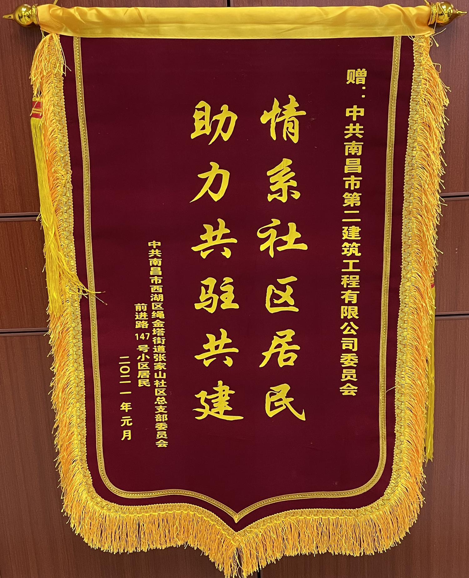 3月9日下午,南昌市西湖區張家山社區干部群眾一行來到南昌市第二建筑工程有限公司,代表社區黨總支部和20多戶社區居民向公司黨委書記、董事長王彥送上“情系社區居民,助力共駐共建”錦旗,并再三表示感謝,言語之間,情意切切。