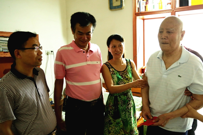 【概要描述】 “七一”建黨節,公司黨委委員、紀檢書記兼工會主席王小華(左一)一行,代表公司黨委對公司離退休原領導干部進行走訪,并送上慰問金,...