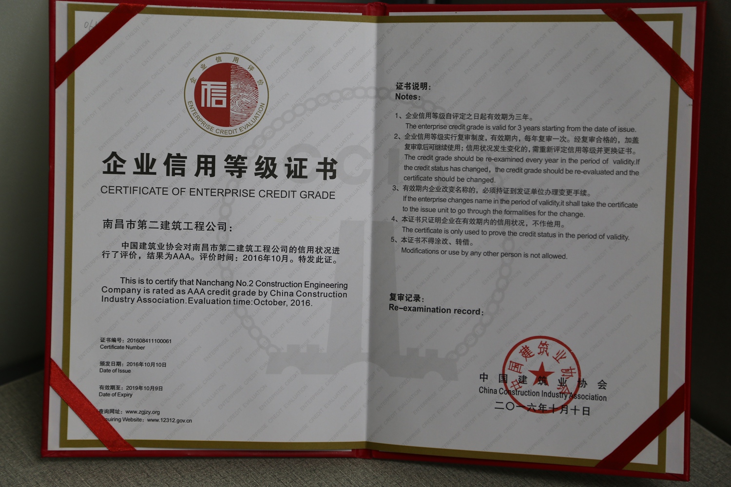 企業信用等級是由中國建筑業協會經審核、篩選和評定而確定的,有效期3年,每年復審一次。由于公司一直本著誠信、服務、質量為上的原則,獲得了中國建筑業協會及社會大眾的認可,2016年10月公司再度榮獲“AAA級信用企業”的榮譽稱號。這個全國建筑行業都為數不多的榮譽是對我們企業的肯定及嘉獎,讓我們樹起信譽旗幟,再創輝煌,攜手走得更好、更遠。