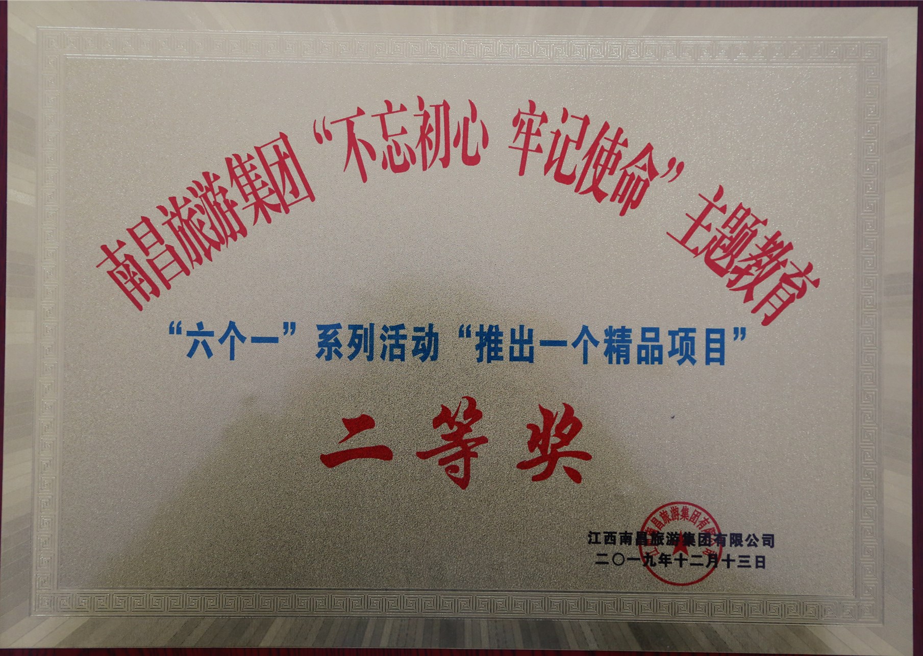 12月13日下午,南昌旅游集團在滕王閣會見廳召開“不忘初心、牢記使命”主題教育“六個一”活動暨董事長獎勵表彰大會,我公司參評的“推出一個精品項目”榮獲二等獎,“突破一個基層難點”榮獲三等獎,“樹一個模范人物”、“講一個初心故事”、“擦亮一個服務窗口”、“創一個先鋒黨支部”榮獲優秀獎。另外,我公司參與合作的“繩金塔項目EPC招標攻堅團隊”榮獲董事長特別獎。