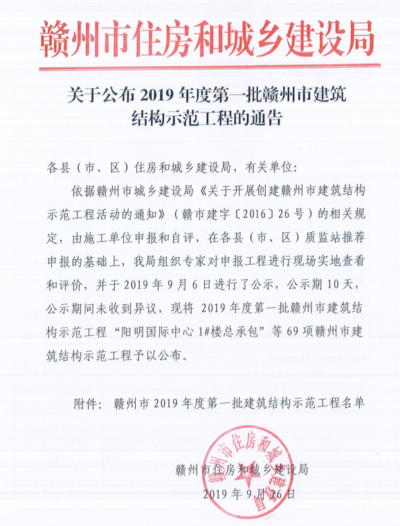 公司承建的贛州.綠地國際博覽城配套商住小區三期項目榮獲贛州市2019年度第一批建筑結構示范工程。